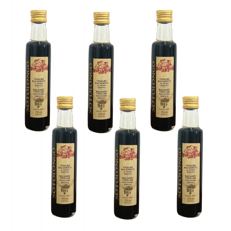 Vinagre de vino al Pedro Ximenez, Balsámico 6º Sotolongo,variedad uva 100% Pedro Ximenez.Resulta a la vista de color caoba muy oscuro, a la nariz es sabroso y muy rico en matices.